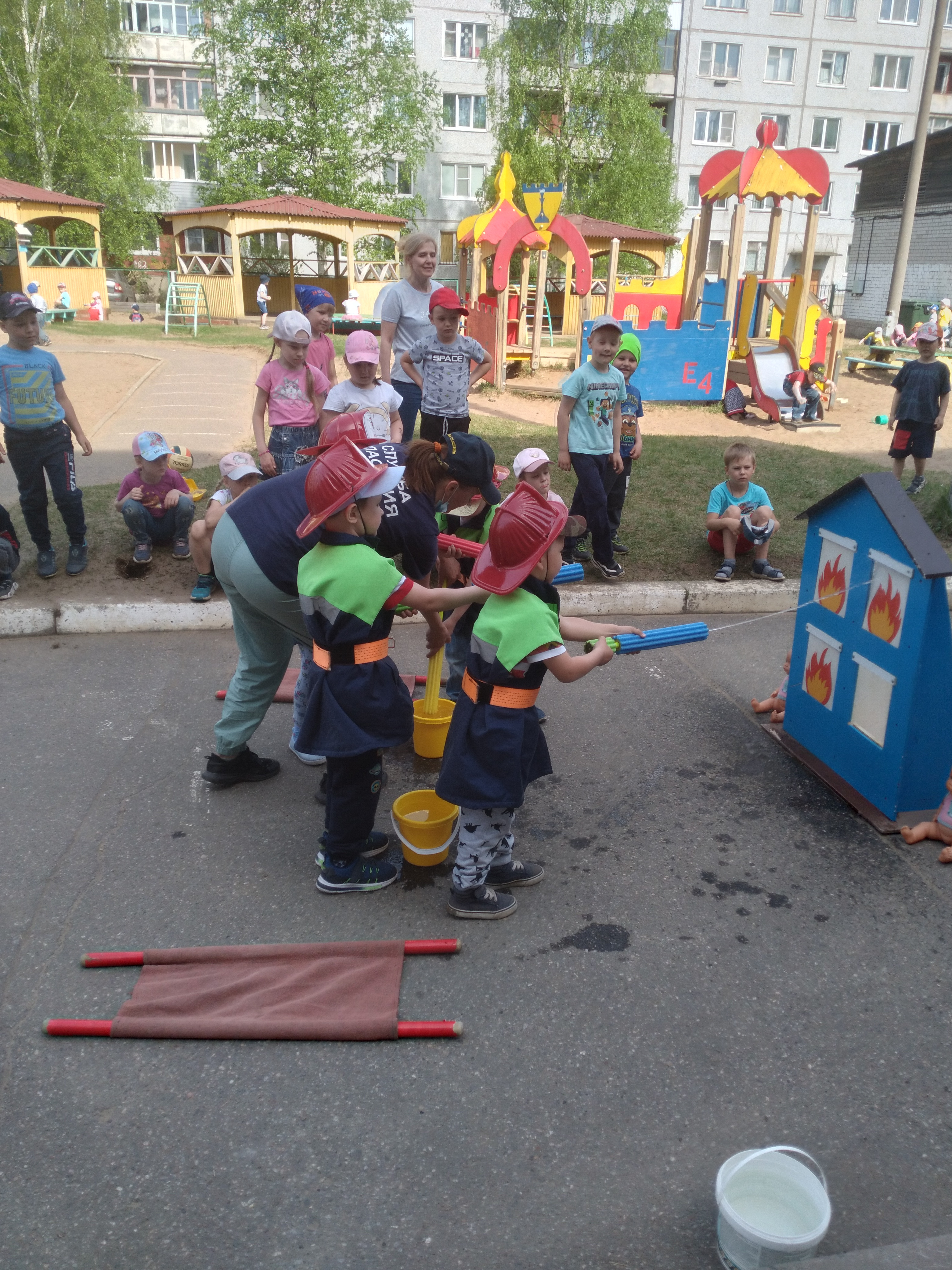 Акция “Вместе весело играть” – дети из всех групп совместно с сотрудниками МЧС в игровой форме провели соревнования по тушению пожара