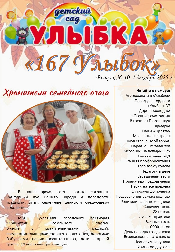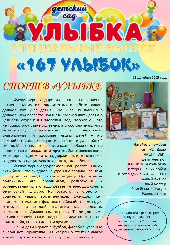 В нашем детском саду вышла в свет информационно-консультативная газета «167 Улыбок». Почему появилась идея выпускать в детском саду свою газету? Сейчас во время изменений, происходящих во всех сферах жизни, в том числе, и в образовательной области, особое значение приобретает функция информирования. Мы – педагоги, всегда находились в тесном диалоге с нашими самыми близкими партнёрами – семьями воспитанников. Но сегодня, с переходом на новые стандарты, с учётом увеличивающегося количества родителей, отличающихся занятостью, с внедрением новых источников получения информации, мы тоже решили взять курс на поиск удобных содержательных форм общения с нашими партнёрами. Одним из таких вариантов станут систематичные встречи на страницах газеты «167 Улыбок». Для реализации данной идеи была создана творческая группа, результатом работы которой стал проект с одноимённым названием «167 Улыбок», конкретной целью которого явилось создание и обеспечение ежеквартального выхода в рамках детского сада информационно-консультативной печатной газеты.